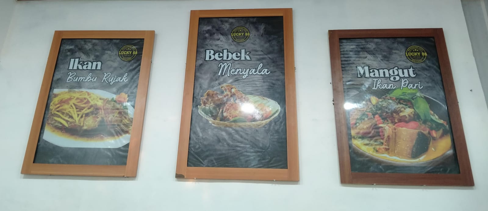 Menyajikan konsep Seafood dan Nusantara, Cafe dan Resto Lucky88 tentunya memiliki menu andalan. Yakni bebek menyala, ikan bumbu rujak, mangut ikan pari, serta menyediakan ikan yang masih fresh.