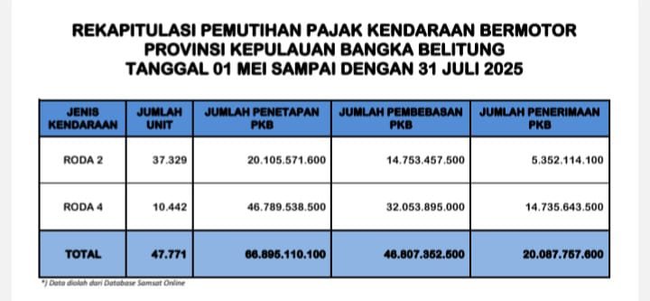 Rekapitulasi pemutihan Pajak Kendaraan Bermotor (PKB) Provinsi Kepulauan Bangka Belitung, periode 1 Mei – 31 Juli 2025. Tercatat, Pemerintah Provinsi Kepulauan Bangka Belitung menerimaan pembayaran PKB dari program itu sebesar Rp20.087.757.600 atau sekitar Rp20 miliar.