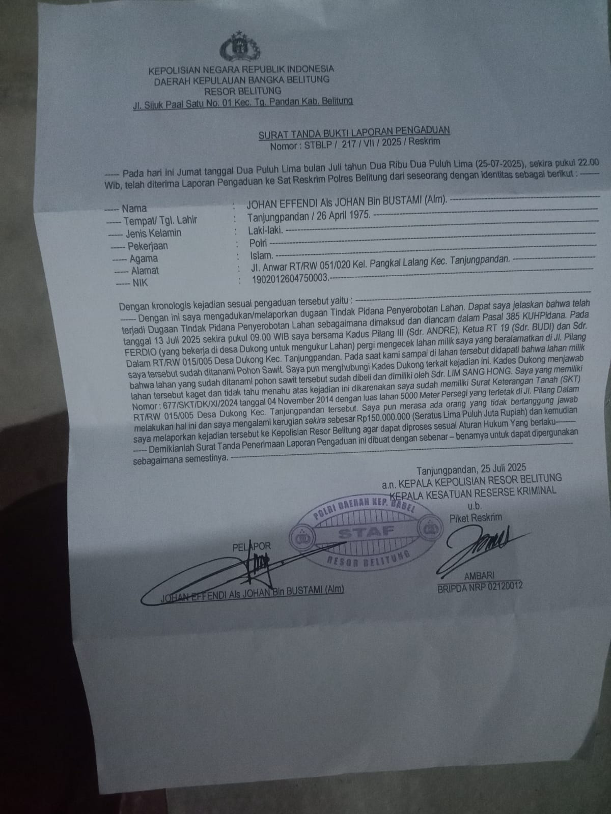 Laporan itu dibuat oleh Johan, warga Tanjungpandan, pada Jumat (25/7/2025), dengan Nomor: STBLP/217/VII/2025/Reskrim. Johan mengaku kalau lahannya seluas 5.000 meter persegi telah dikuasai pihak lain tanpa seizin dirinya.
