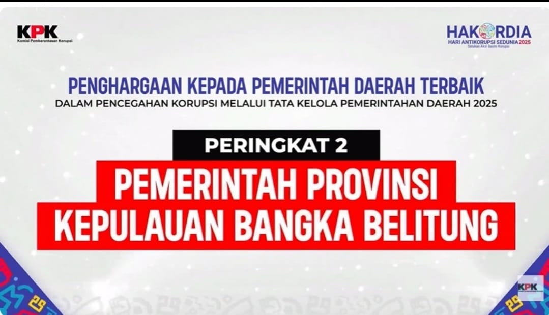 Pada peringatan Hari Antikorupsi Sedunia (Hakordia) 2025, Komisi Pemberantasan Korupsi (KPK) menetapkan Pemprov Babel sebagai Pemerintah Daerah Terbaik Peringkat 2 dalam upaya pencegahan korupsi melalui tata kelola pemerintahan daerah.